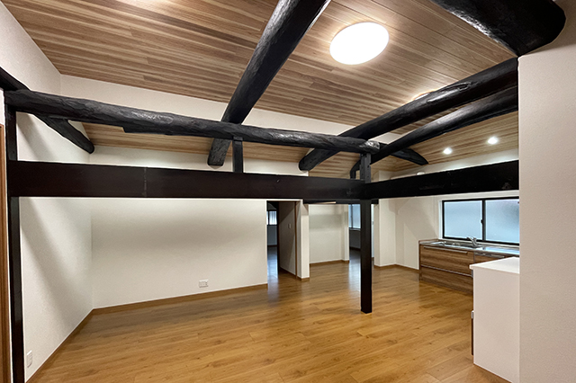 どこか懐かしい昔の趣を残した佇まい。焼き板に合う和モダンな雰囲気の玄関扉を開けると高級料亭を思わせる畳敷きの玄関ホールが出迎えてくれる。 LDKや洗面トイレなどの水回りを中心に古民家ならではの趣を大切にしたリフォーム。 天井を上げ、ダイナミックな梁を生かして空間に広がりを持たせた。水回りはランドリースペースを広くとり、毎日の家事を楽に。 家族の歴史を知る梁に見守られる安心の住まいが完成した。